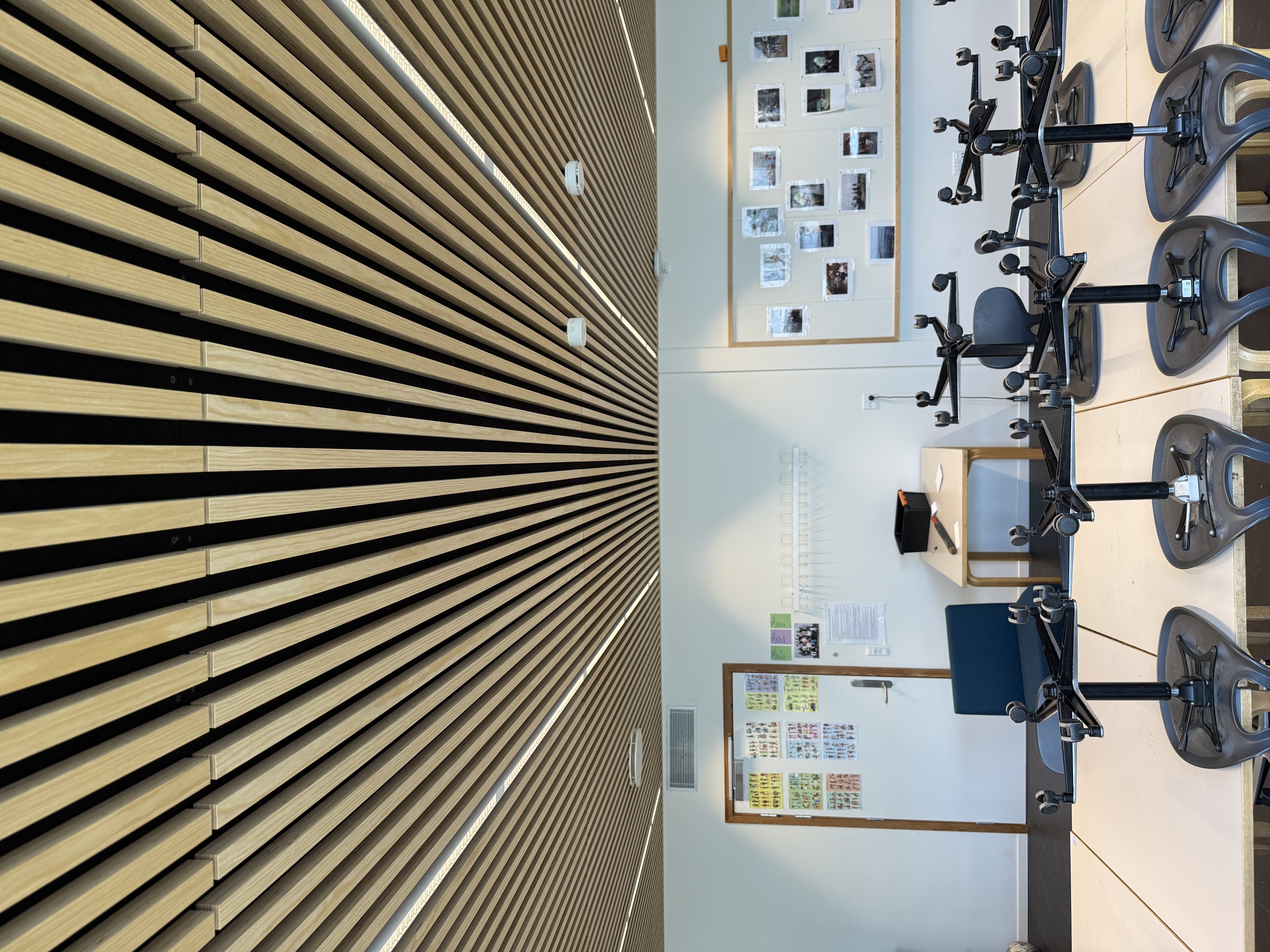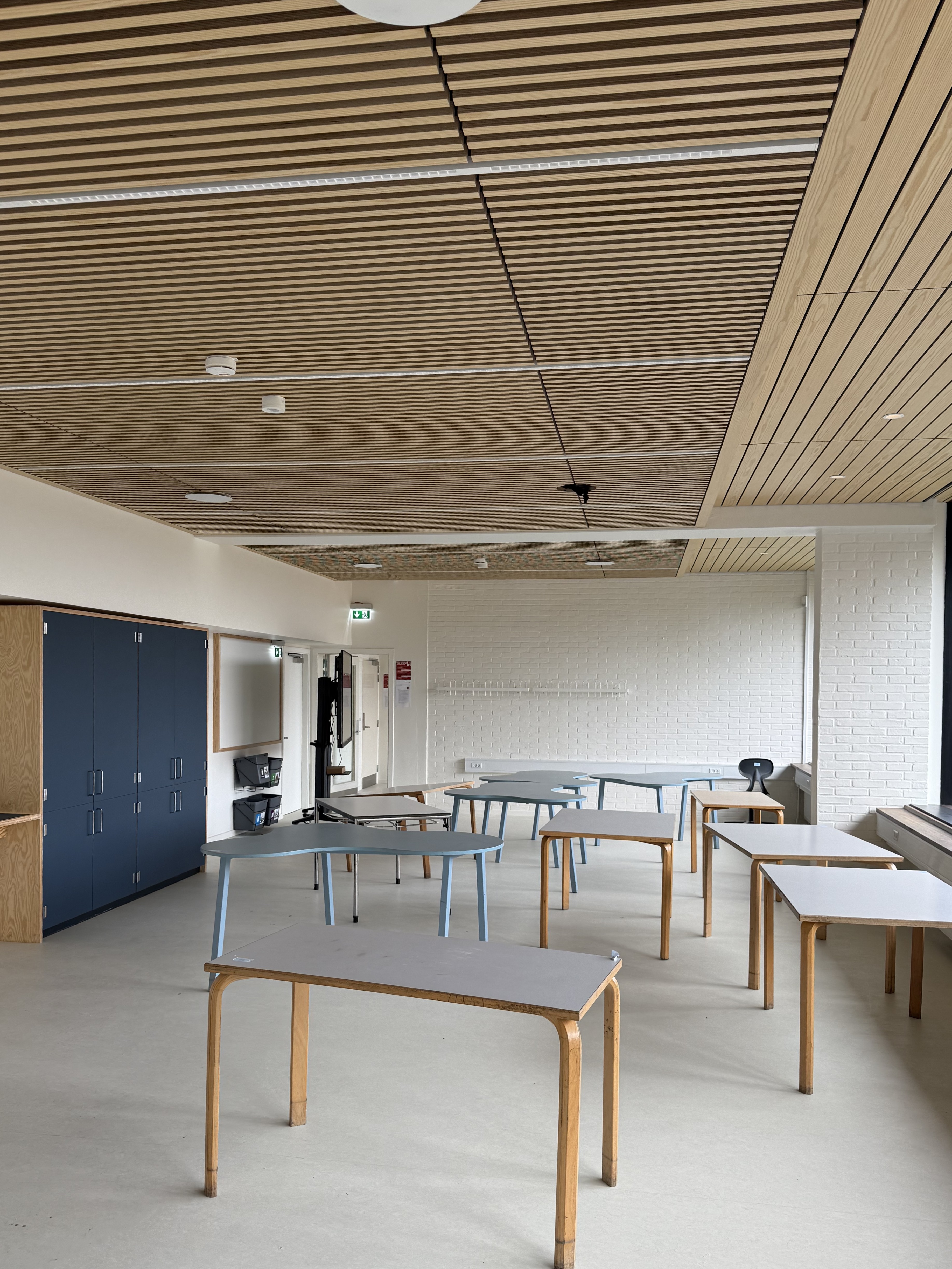 Rekta 30 er sømløst integreret i de specialdesignede træ lamel akustik lofter, som var et ufravigeligt krav for at bevare skolens arkitektoniske udtryk og kulturhistoriske værdi.